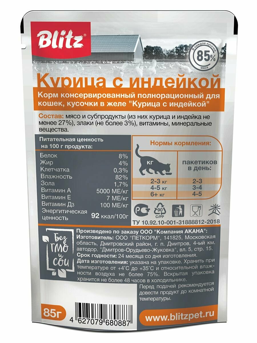 Консервированный корм BLITZ для кошек Курица с индейкой кусочки в желе 85 гр Х 24 шт