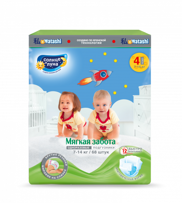 Подгузники одноразовые для детей 4/L 7-14 кг mega-pack 68шт солнце И луна мягкая забота