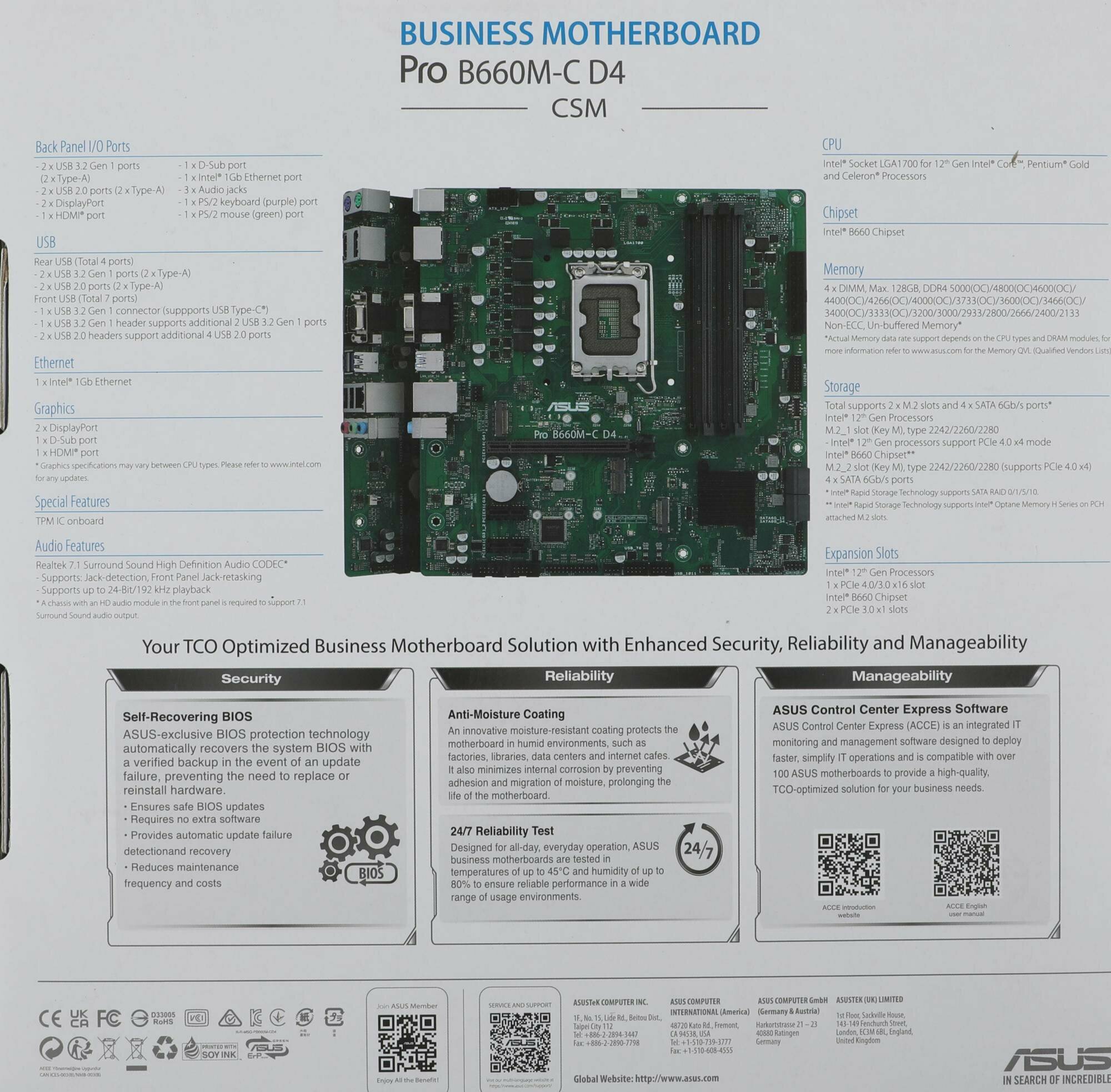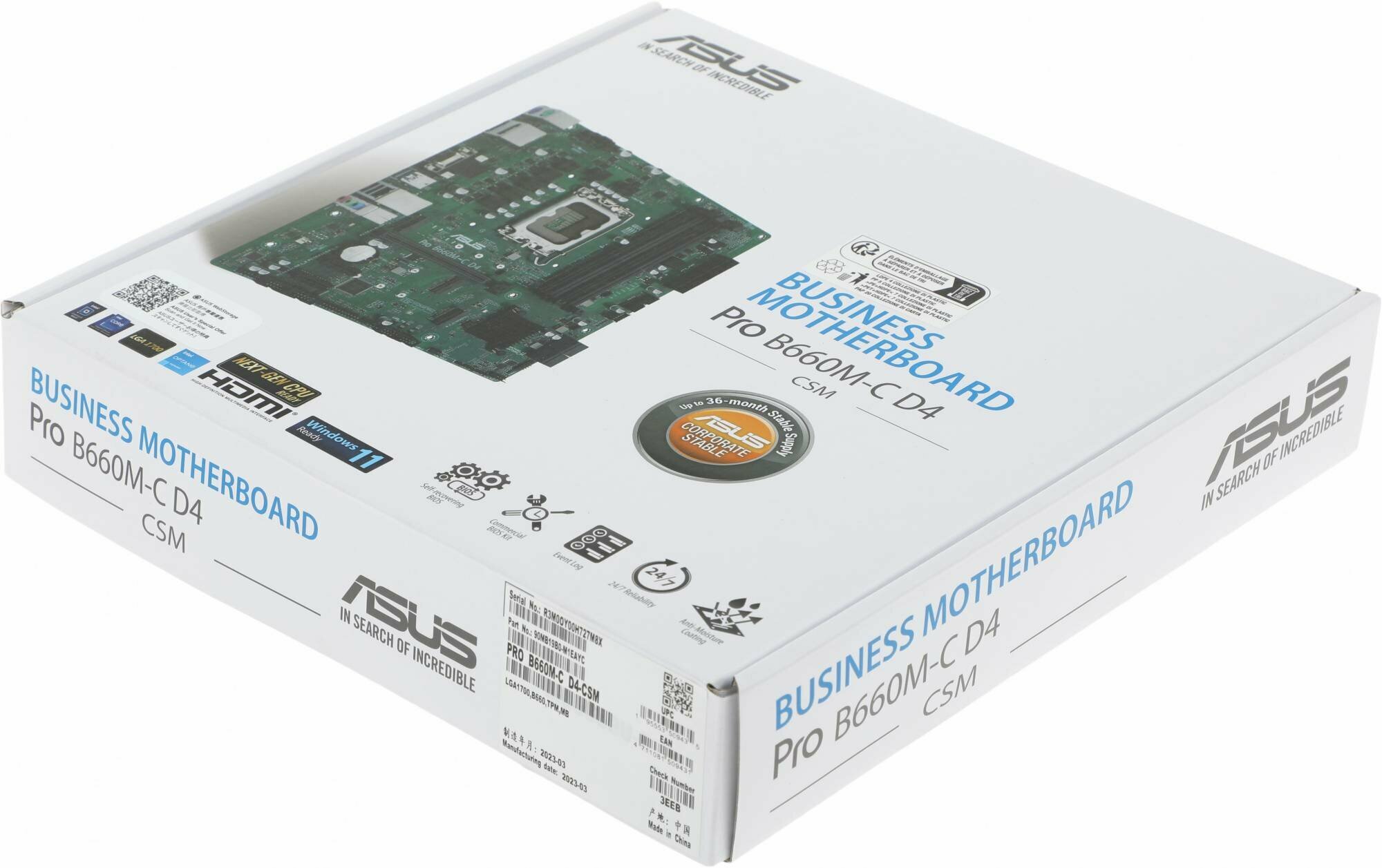 Материнская плата ASUS PRO B660M-C D4-CSM, LGA1700, B660, 4*DDR4, DPx2, HDMIx1, SATA3 + RAID, Audio, Gb LAN, USB 3.2*6, USB 2.0*