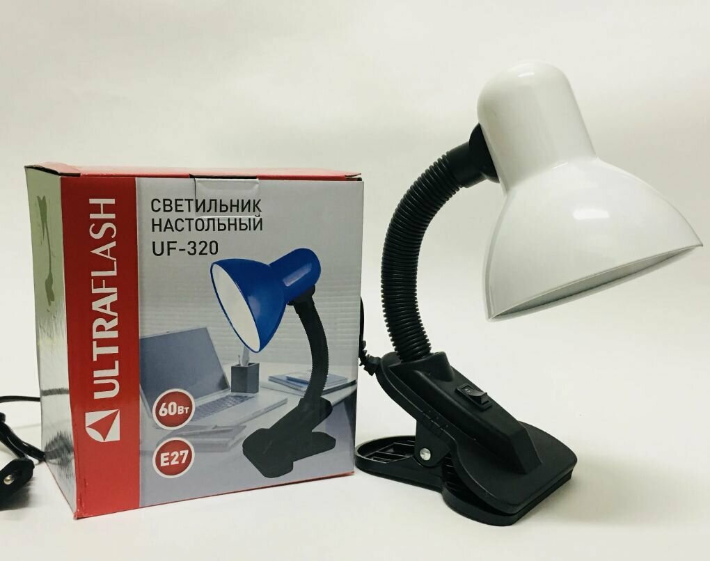 Настольная лампа (светильник) прищепка Ultraflash UF-320P C01 E27 60W металл/пластик белый, пакет e12370