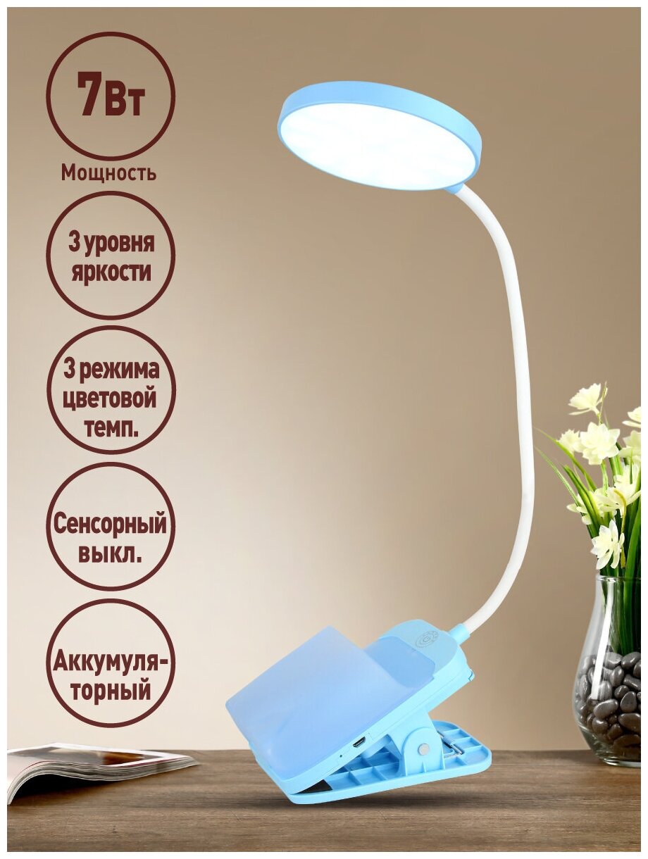 Светильник светодиодный настольный ultraflash 7Вт 3 уровня яркости с прищепкой голубой