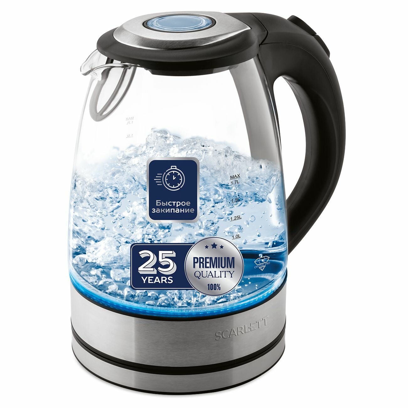 | Отзыв: | Решилась на стеклянный, т.к. хотелось прозрачный с синей подсветкой + чтоб были видны стадии кипения (для заваривания хорошего чая).