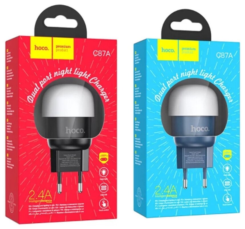 Сетевое зарядное устройство (СЗУ) Hoco C87A (2 USB) + ночник, 2.4 А, черный