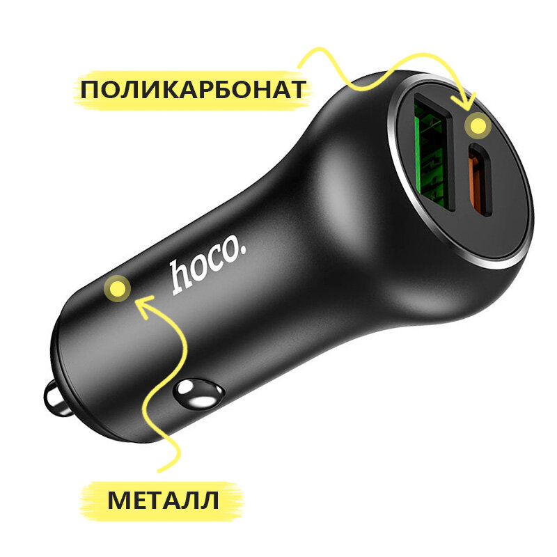 Автомобильное зарядное устройство для телефона, планшета в прикуриватель Hoco, разъемы USB+USB Type-C, быстрое 38W, черное, для iPhone, Android