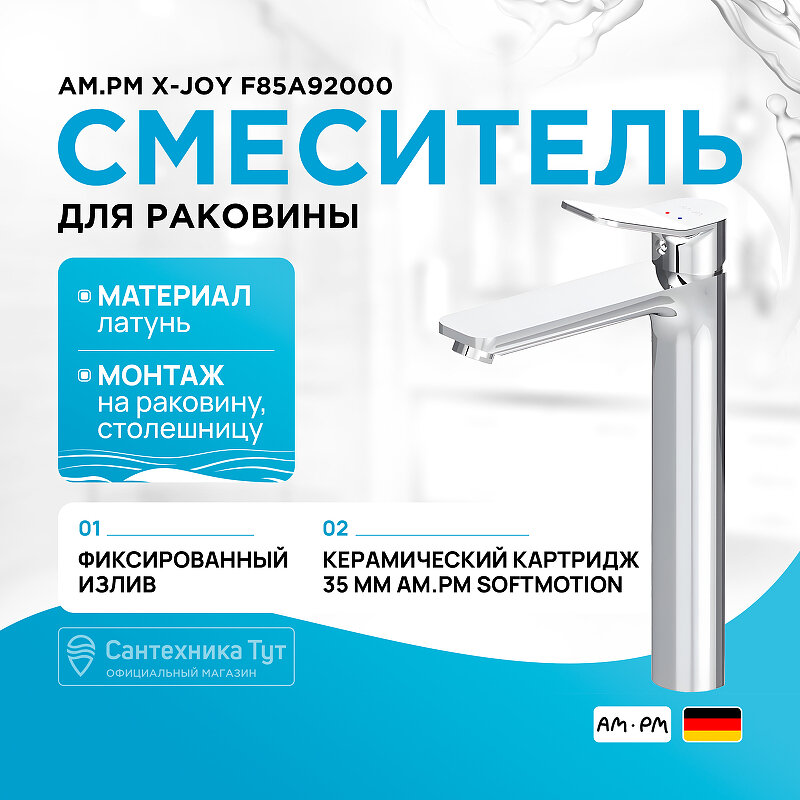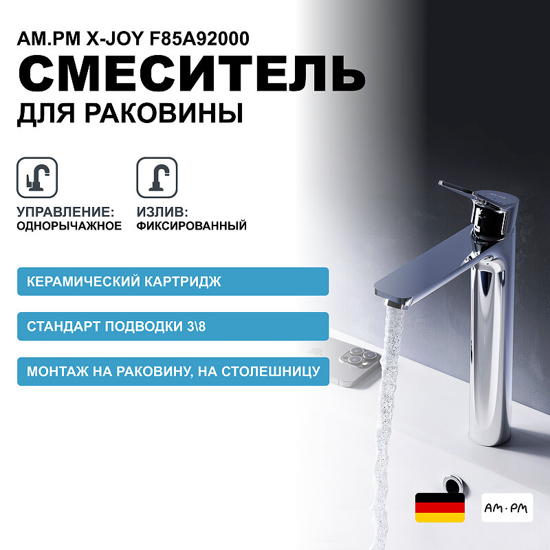 Смеситель для накладной раковины в ванную AM.PM X-Joy F85A92000, кран для ванной, хром, высокий, монолитный излив 155 мм, керамический картридж Soft Motion, гарантия 10 лет, Германия