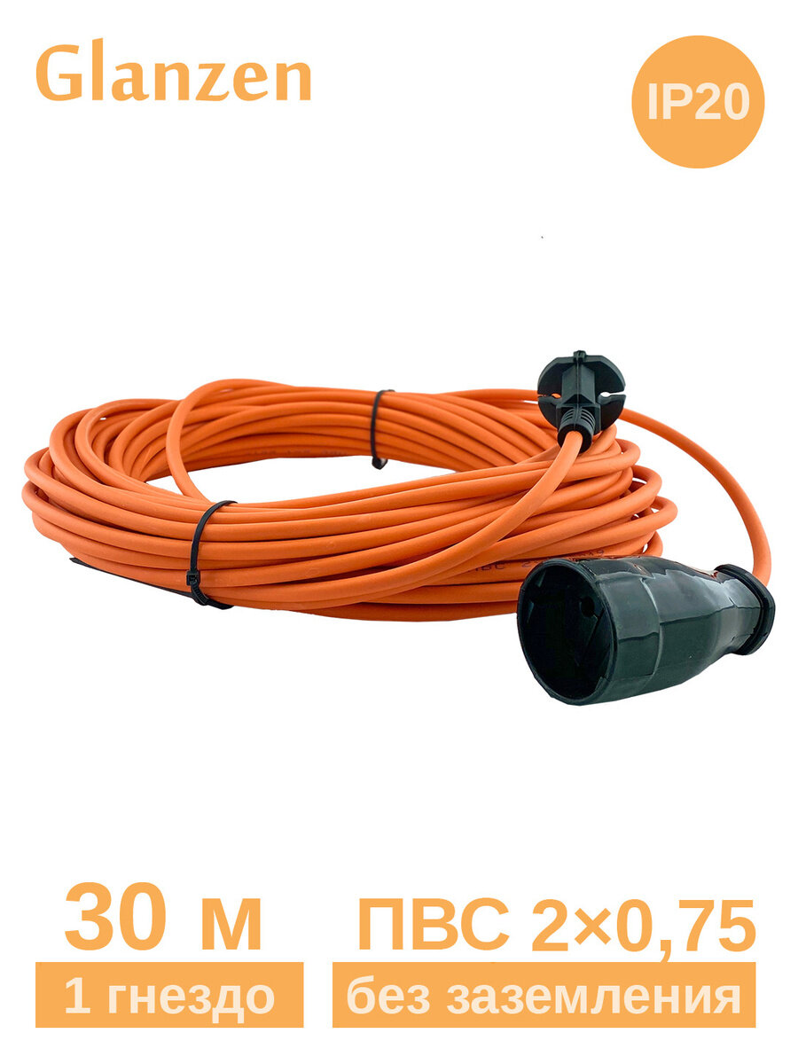 Силовой удлинитель Glanzen шнур, штепсельное гнездо, ПВС 2х0,75, 30 м, арт. ES-30-001 00-00006700
