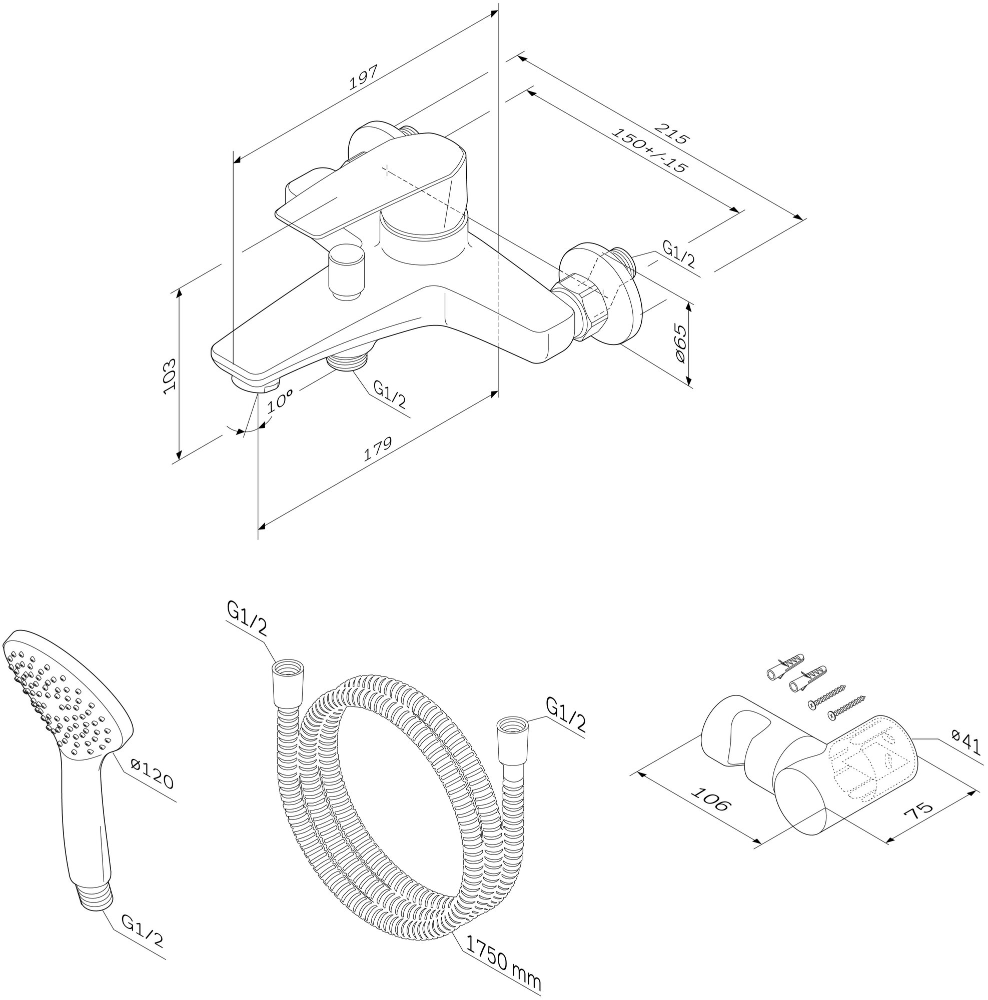 | Комплектация | Смеситель для ванны с подключение душа / лейка душевая / шланг / держатель для душа / эксцентрики / крепления / инструкция |