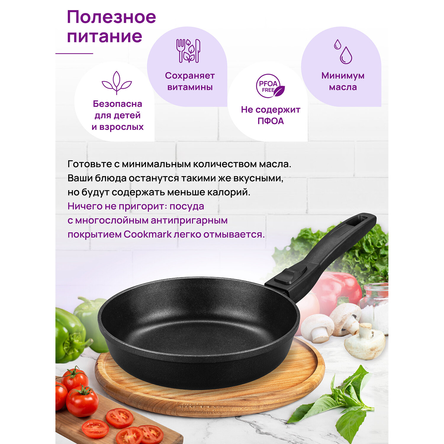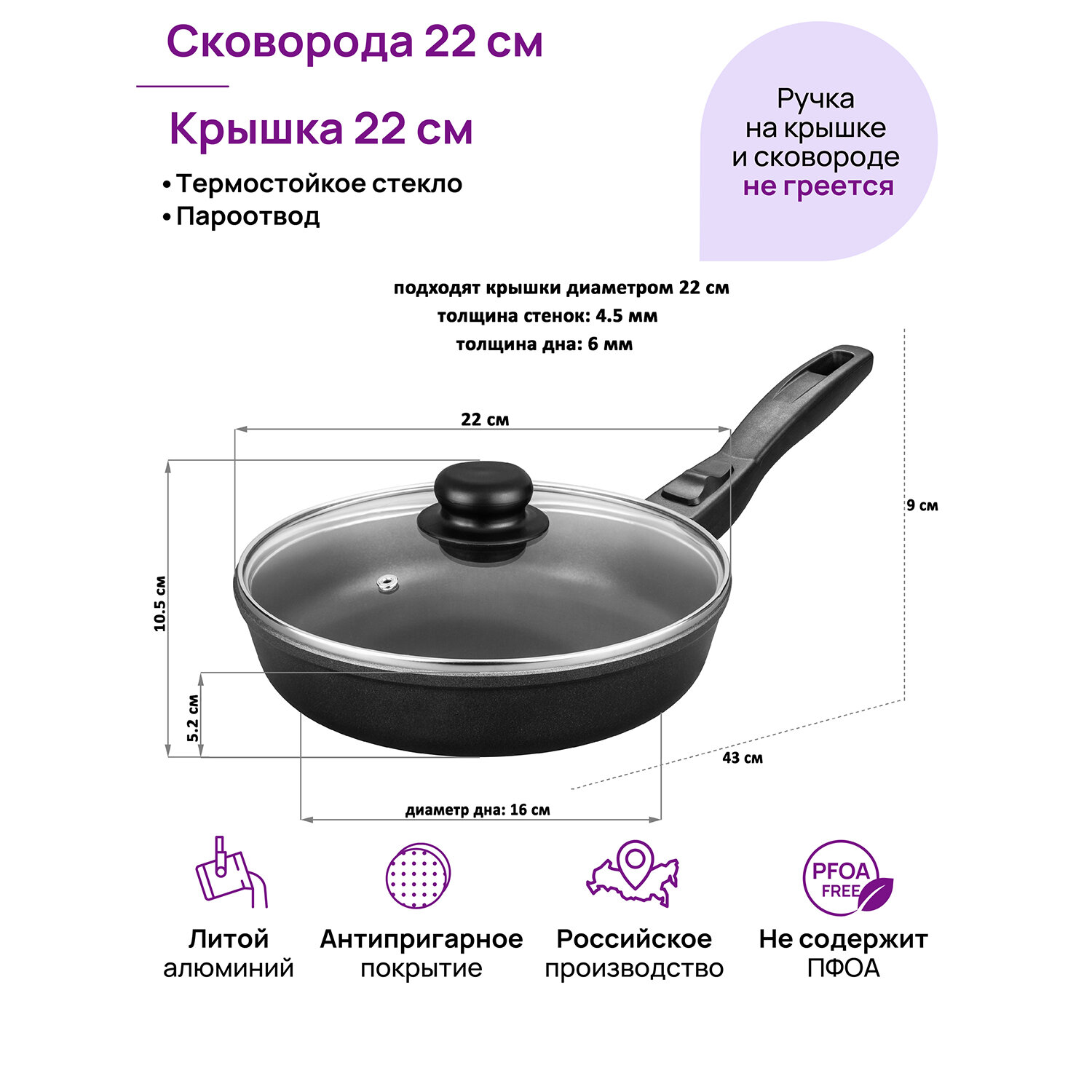 | Комплектация | сковорода, стеклянная крышка, съемная бакелитовая ручка |
