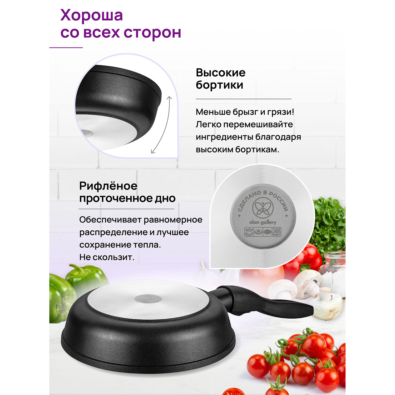 Сковорода глубокая 22 см Elan Gallery гармония вкуса Черный Оникс с крышкой D22, съёмная ручка интересное:
