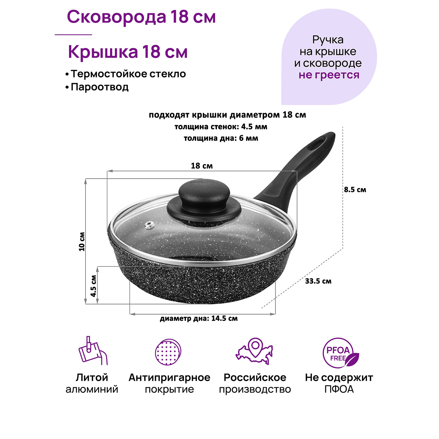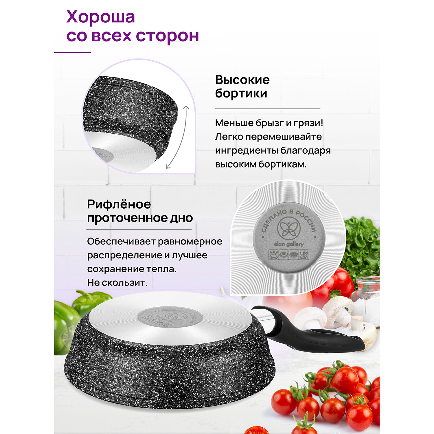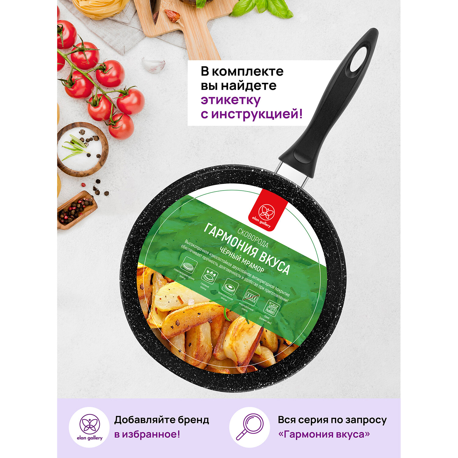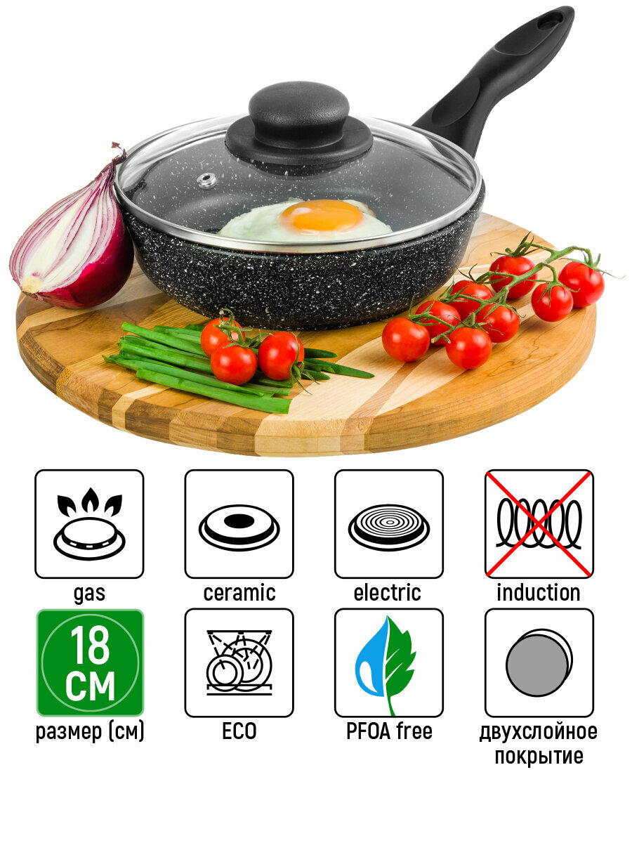 Сковорода глубокая 18 см Elan Gallery гармония вкуса Черный мрамор с крышкой D18, несъёмная ручка интересное: