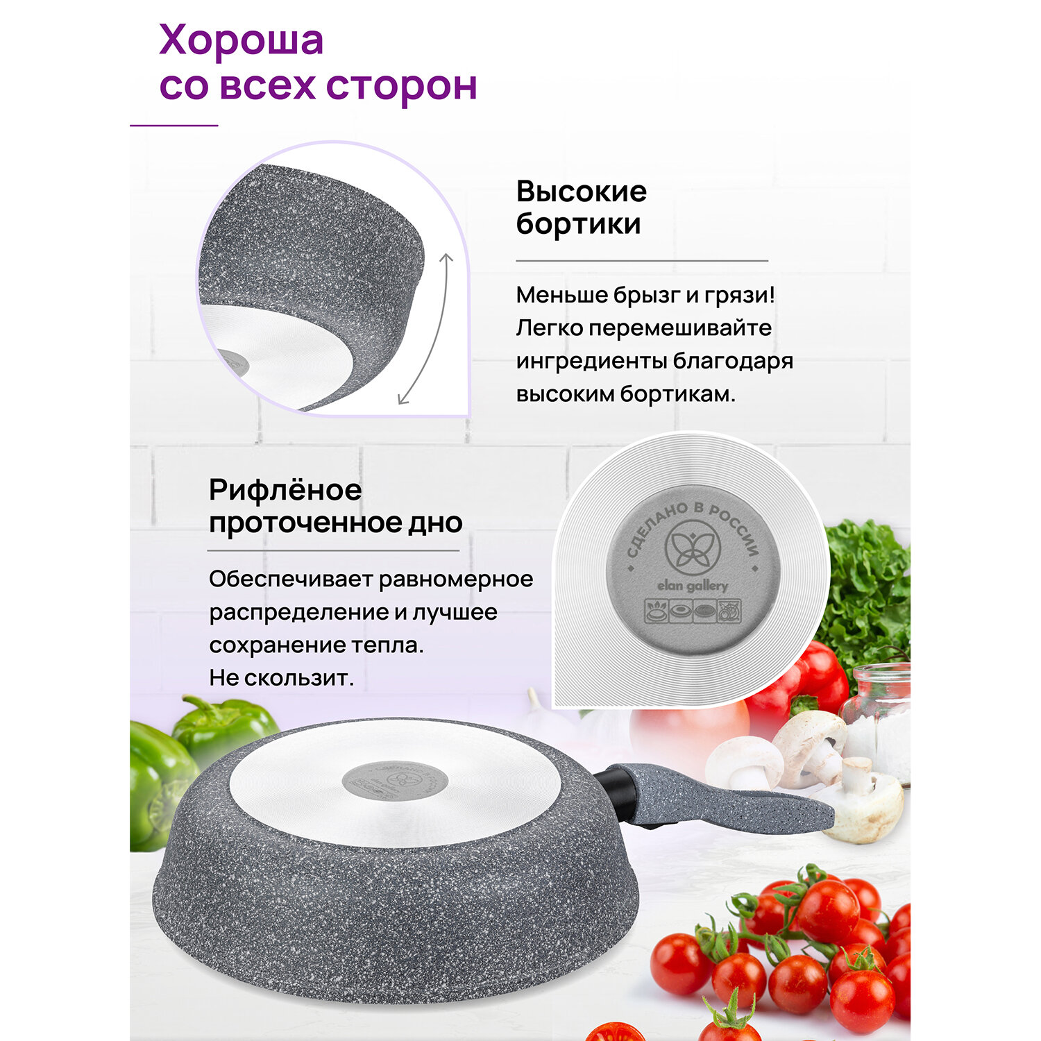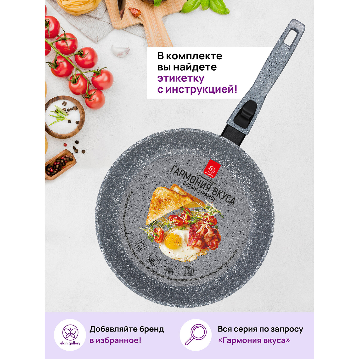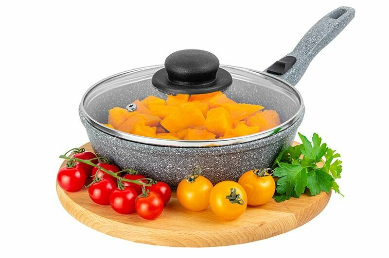Сковорода глубокая 20 см Elan Gallery гармония вкуса Серый мрамор с крышкой D20, съёмная ручка интересное: