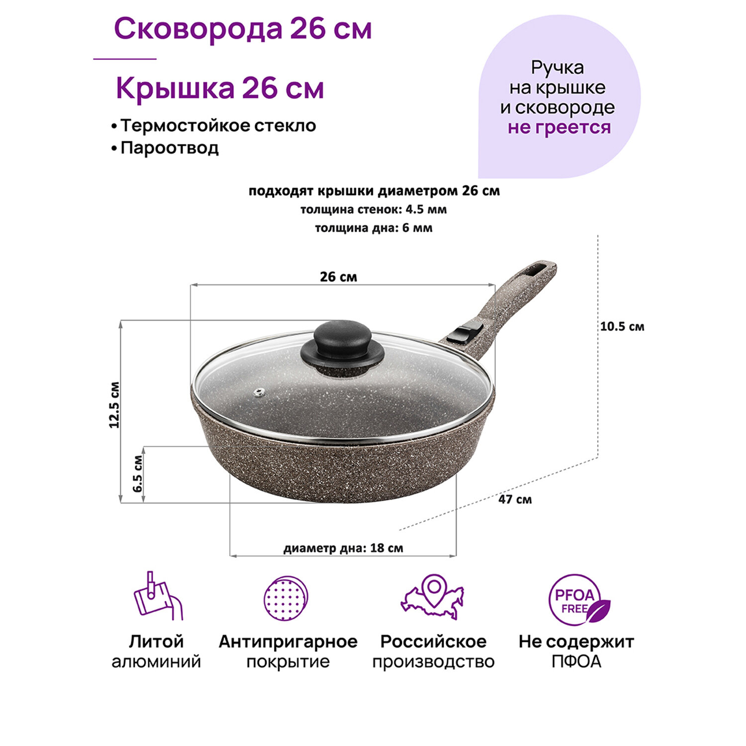 | Комплектация | сковорода, стеклянная крышка, съемная бакелитовая ручка |