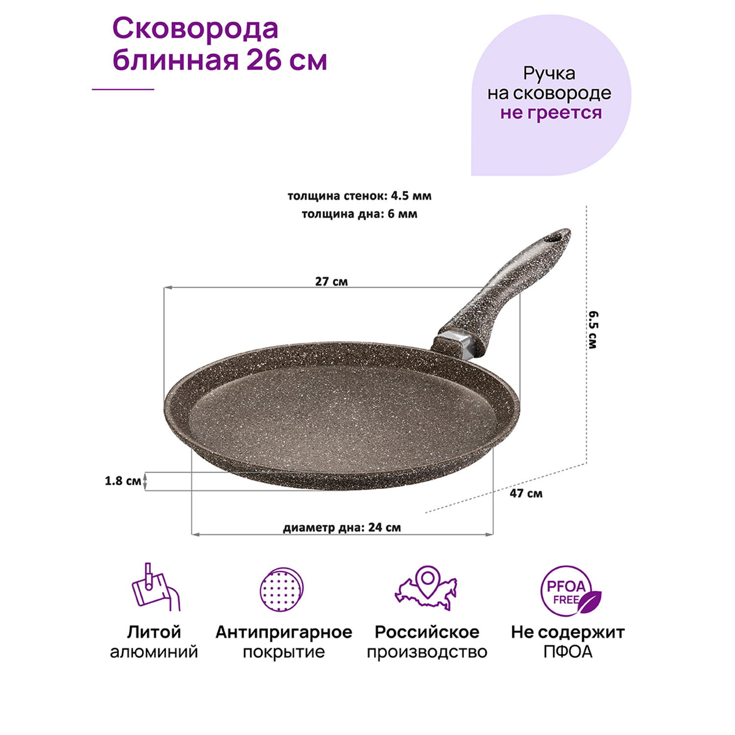 Сковорода блинная 26 см Elan Gallery гармония вкуса Коричневый опал, с несъёмной ручкой интересное: