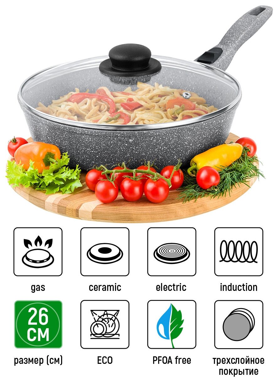 Сковорода глубокая 26 см Elan Gallery гармония вкуса Серый мрамор индукция с крышкой D26, со съёмной ручкой интересное: