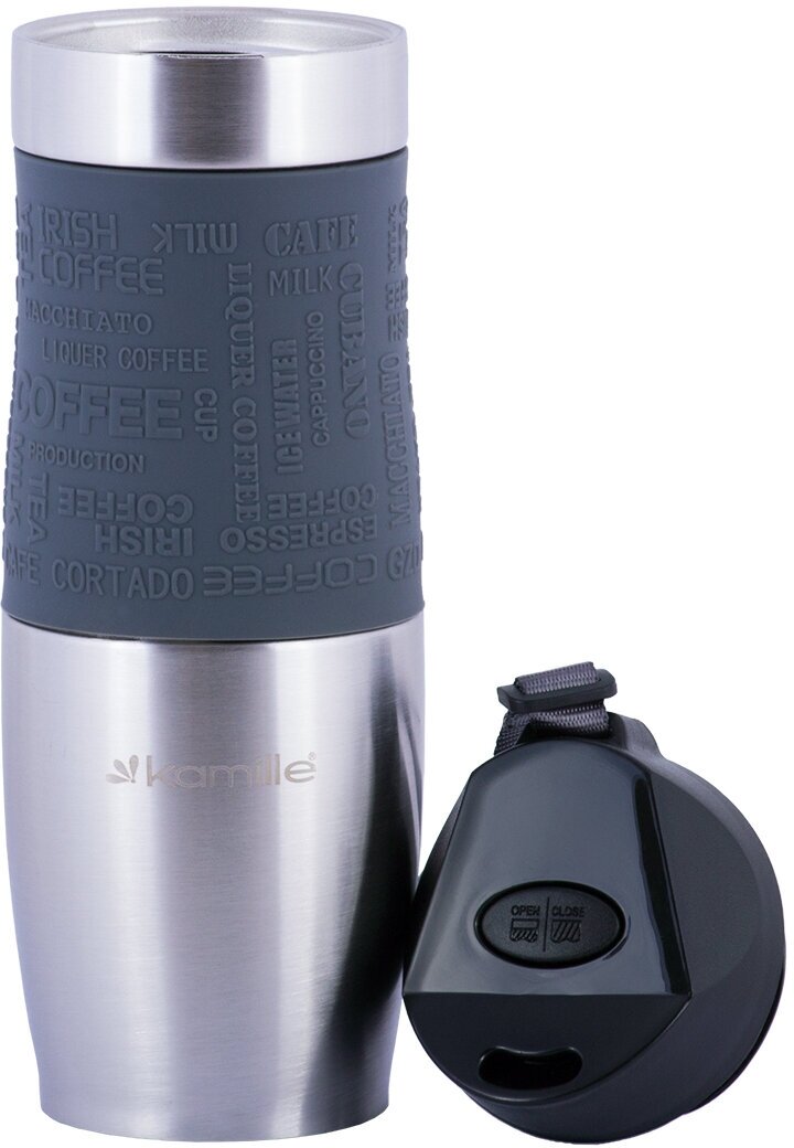 Купить Термокружка Kamille с TPR-вставкой и ремешком (серая) 480 мл