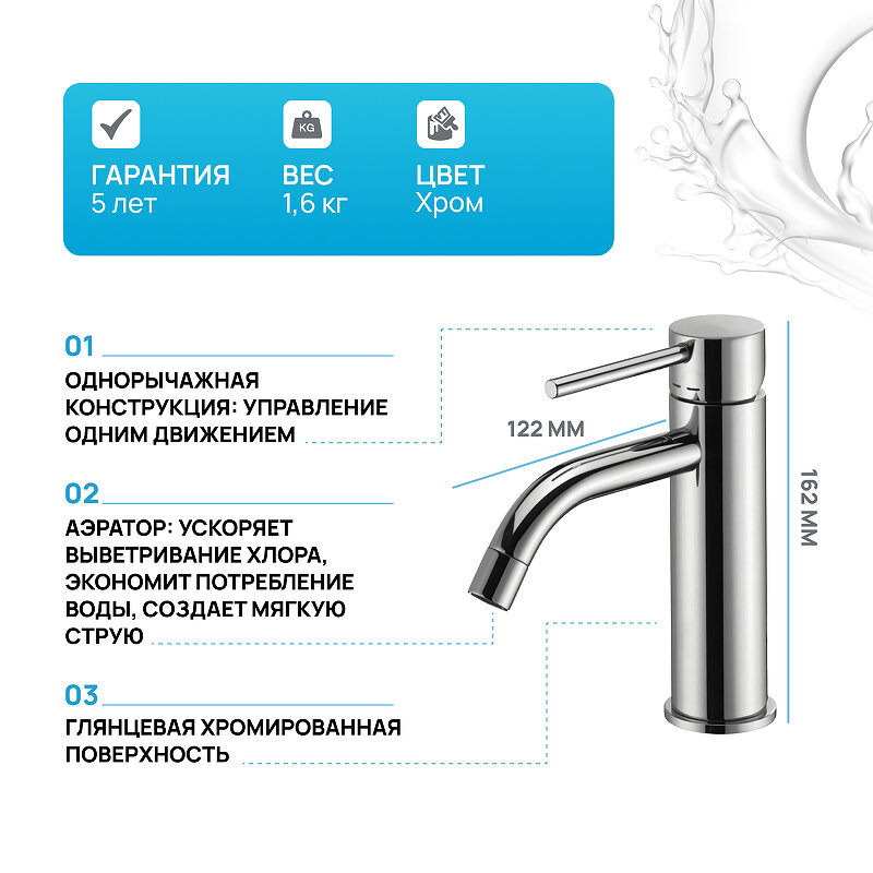Смеситель для умывальника Paffoni Light, арт. LIG071CR, неповоротный излив, без донного клапана