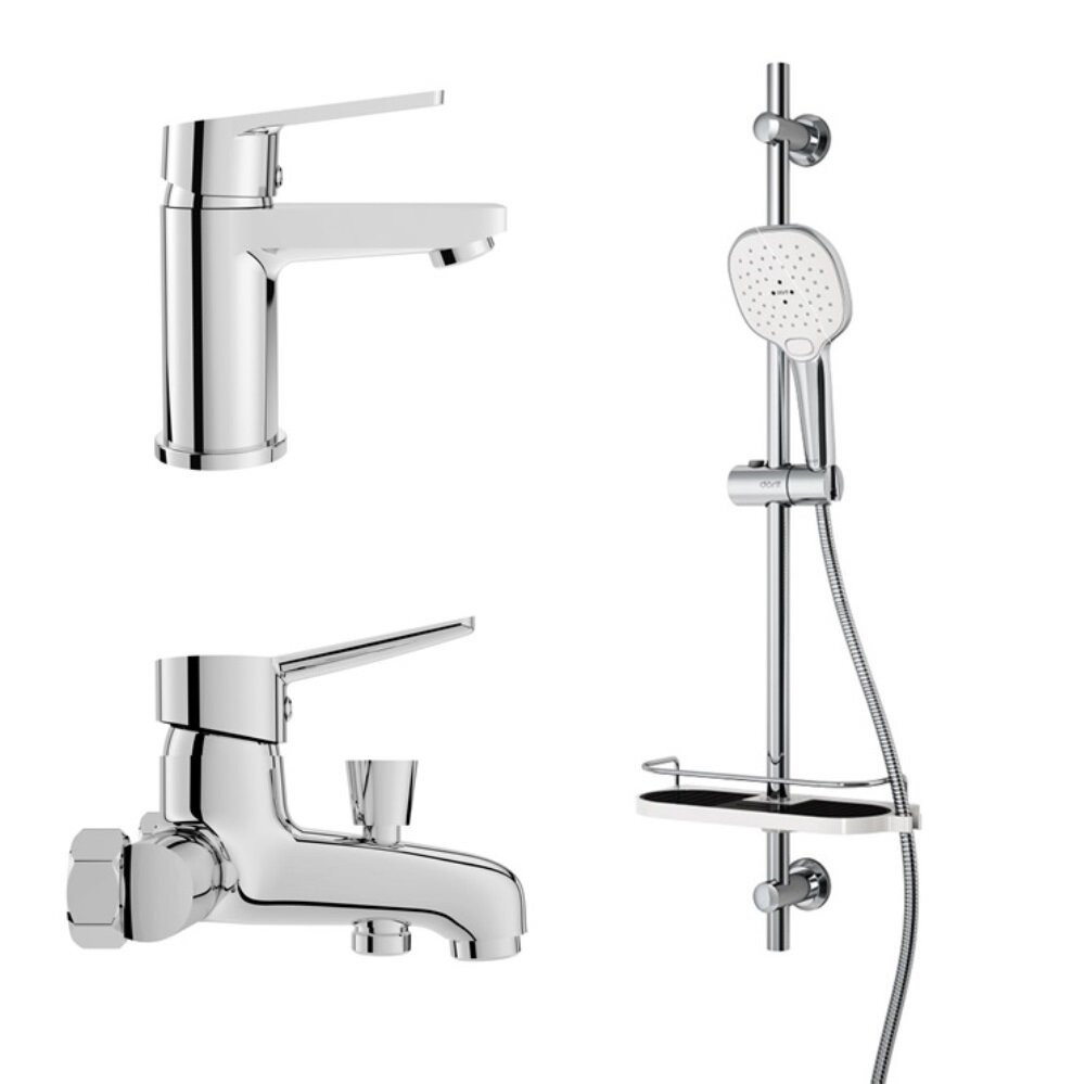 | Комплектация | Смеситель для ванны и душа; Смеситель для раковины;ручной душ;штанга;шланг; полочка;эксцентрики;гибкая подводка;инструкция |