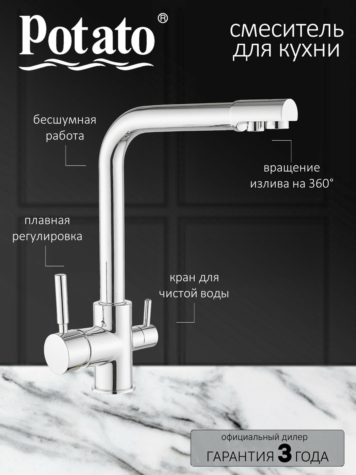 Смеситель на кухню Potato P4498 с краном для фильтрованной воды, картридж 35 мм, хром, крепление гайка интересное: