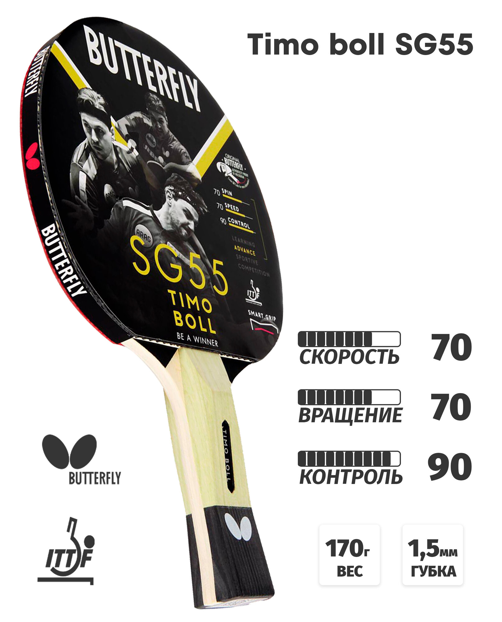 Ниже Вы можете прочитать отзывы на Ракетка для настольного тенниса Butterfly Timo Boll SG55, ознакомится с подробными характеристиками, посмотреть интересные обзоры и фотографии на Ракетка для настольного тенниса Butterfly Timo Boll SG55.