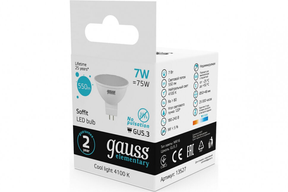 (10 шт.) Светодиодная лампочка Gauss Elementary MR16 GU5.3 220V 7W(550lm) 4100K 4K 57x50 пластик/алюм. 13527