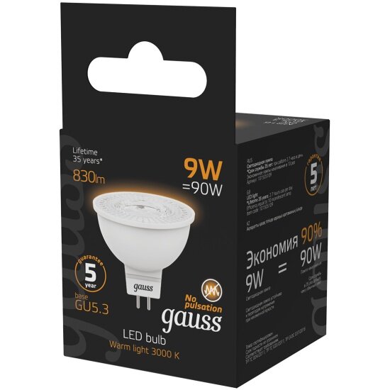 | Плюсы: | Лампы gauss MR16 101505109, GU5.3, MR16, 9 Вт, 3000 К, свет приятный и мягкий. |