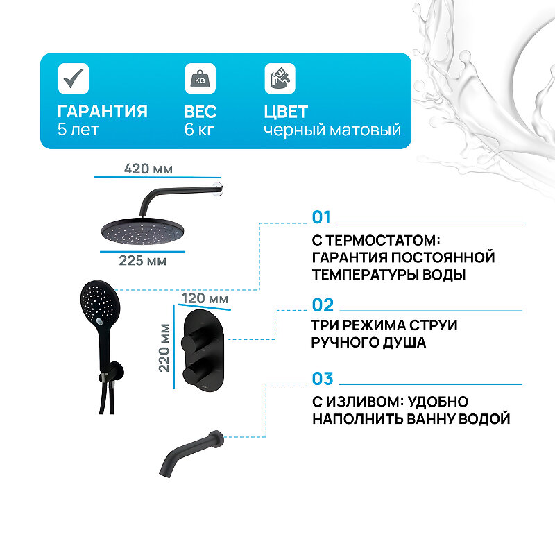 Душевая система WasserKRAFT Elbe A177477 с термостатом Черная матовая