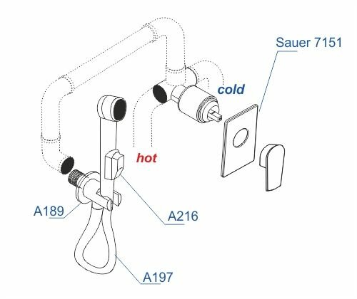 | Комплектация | Смеситель для душа Sauer 7151 Подключение шланга A189 Шланг для душа 1500 мм A197 Гигиеническая лейка с фиксатором A216 |