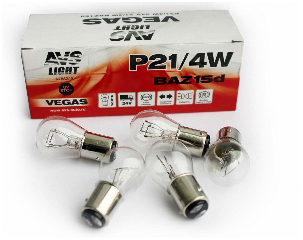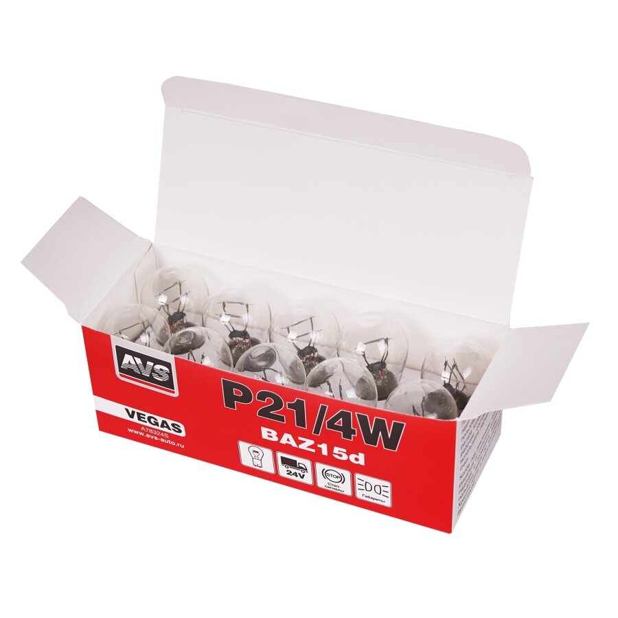 Лампы AVS Vegas, P21/4W, 12 V, цоколь BAZ15D, смещенный штифт, 10 ламп