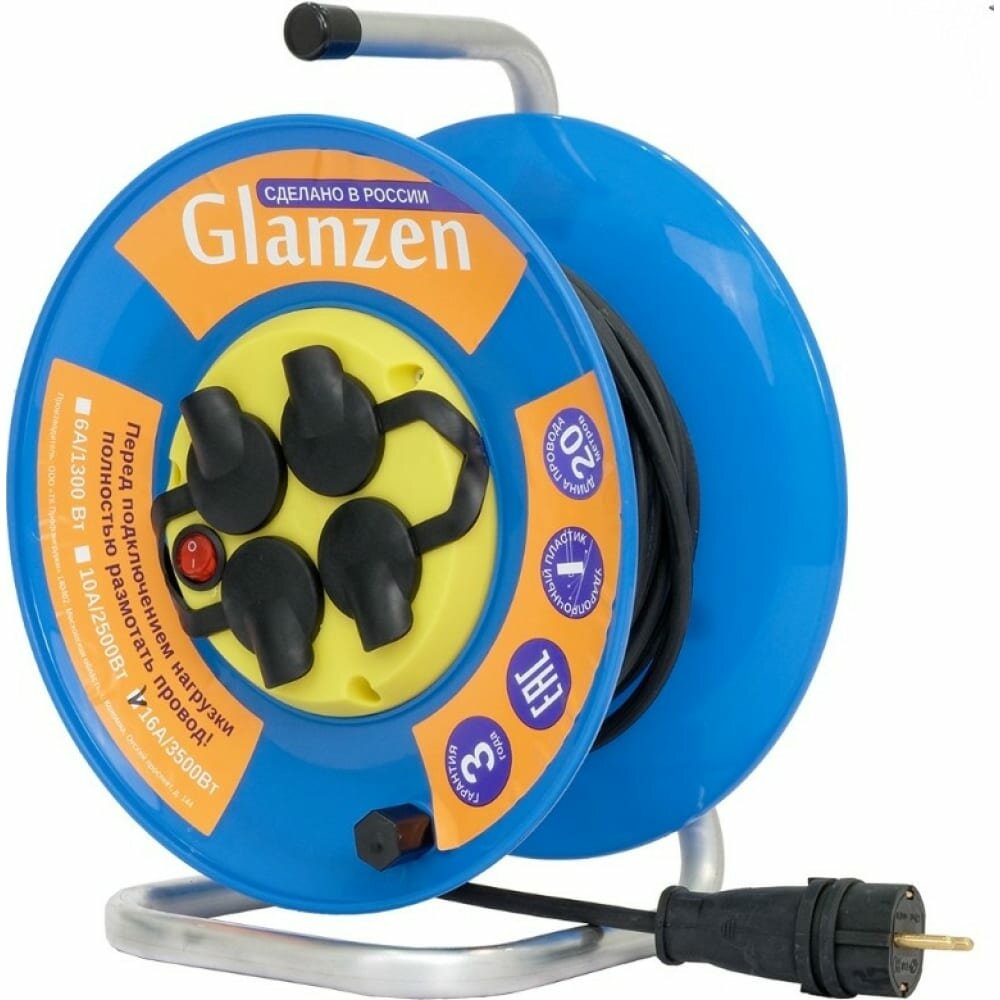 Удлинитель силовой на катушке GLANZEN 4 розетки ПВС 3х1,5 20м EB-20-019
