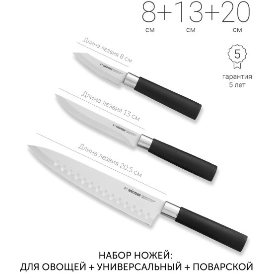 | Типы ножей в наборе | нож для овощей, универсальный нож, шеф-нож |