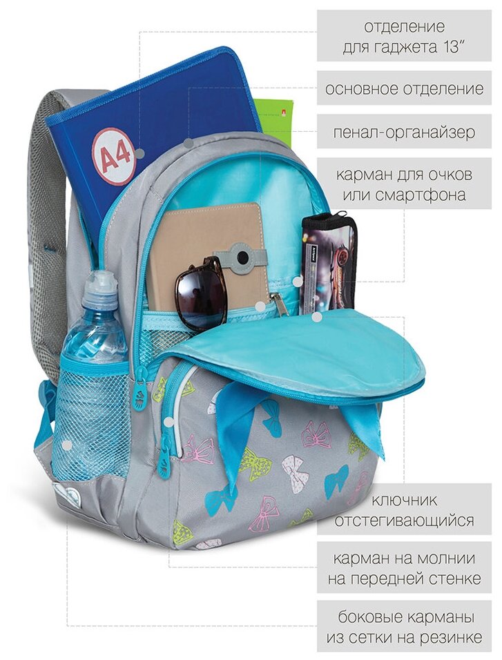 Рюкзак школьный GRIZZLY с карманом для ноутбука 13", анатомической спинкой, для девочки RG-464-1/1