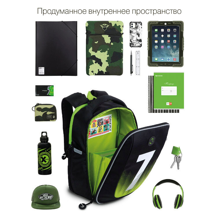 Ранец рюкзак школьный Grizzly RAf-293-5 Черный - салатовый интересное:
