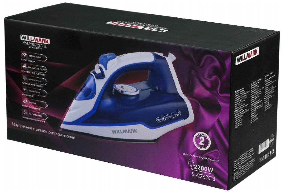 Утюг WILLMARK SI-2267CB, 2200 Вт, антипригарная подошва, 20 г/мин, 210 мл, сине-белый интересное: