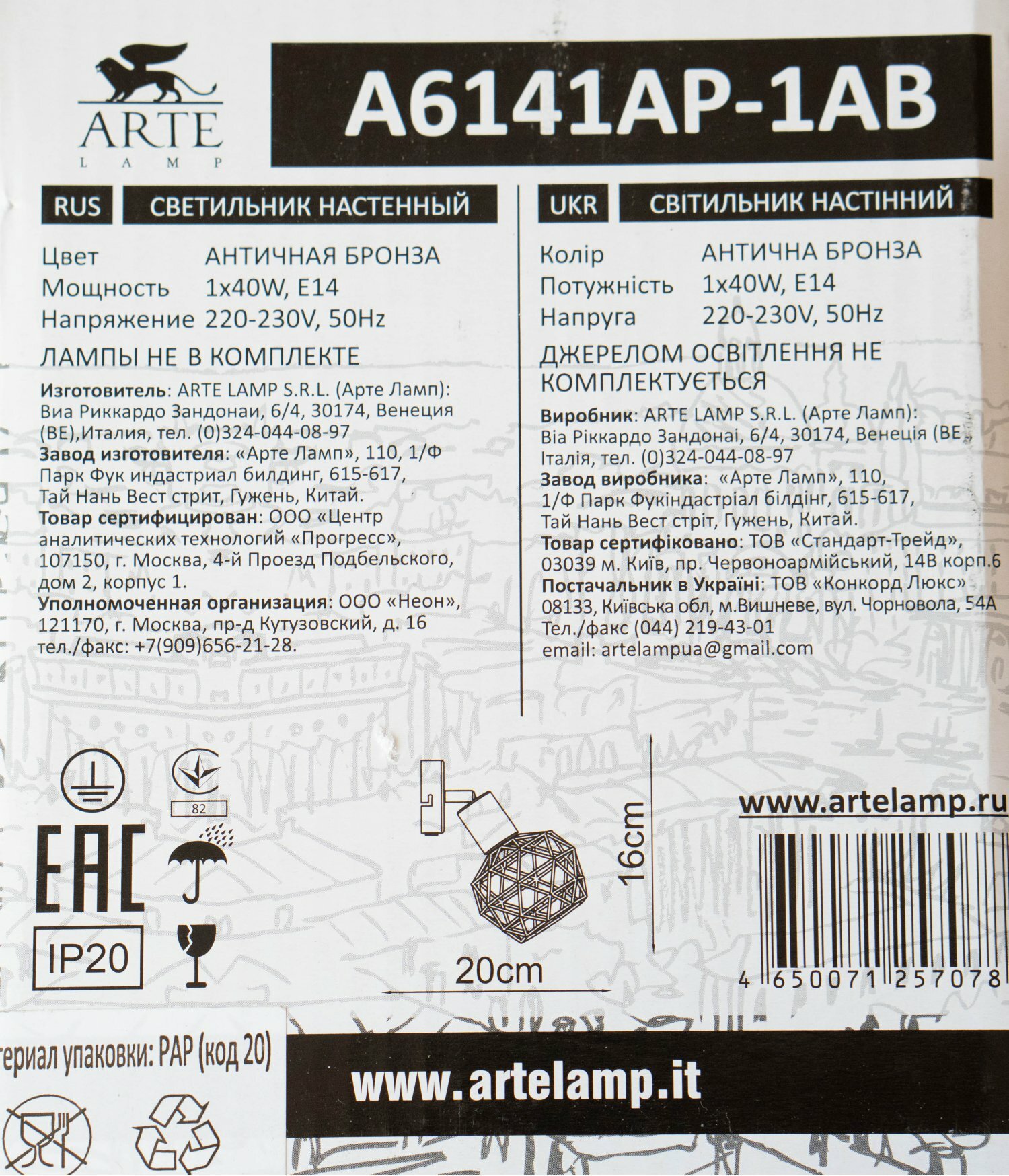 Светильник спот Arte Lamp Sospiro A6141AP-1AB, E14, кол-во ламп:1шт., Бронза