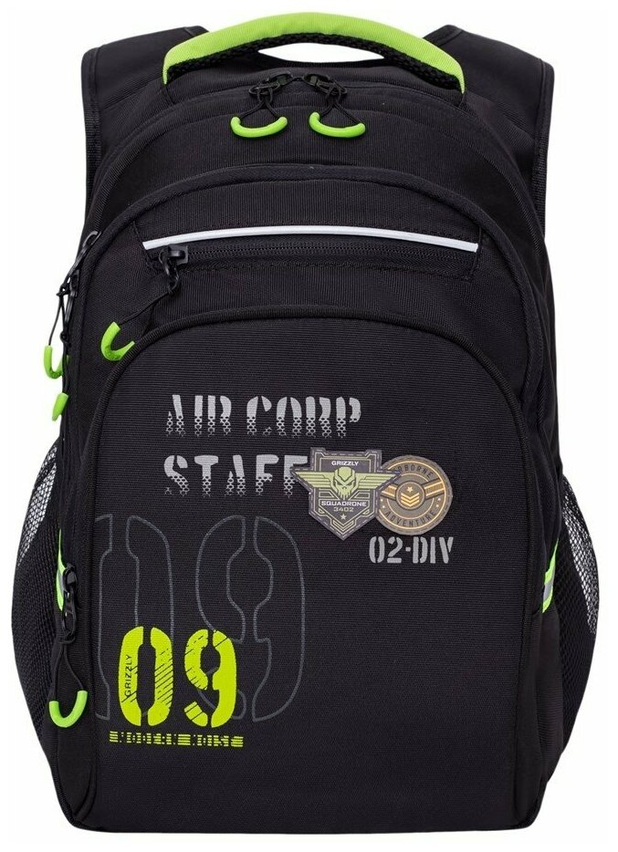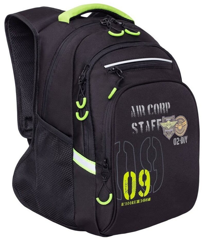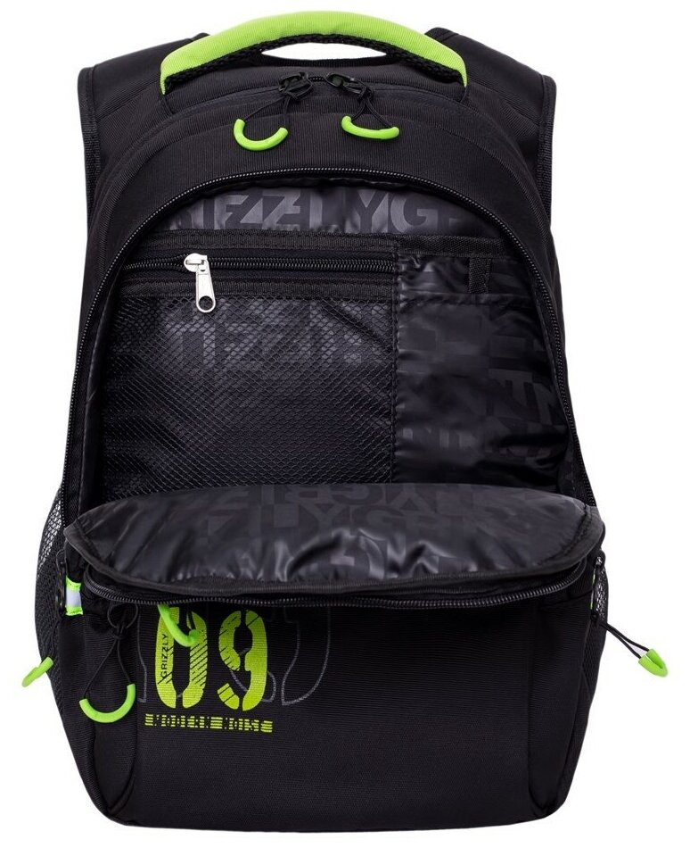 Купить Рюкзак Grizzly, 26*39*20см, 2 отделения, 4 кармана, анатомическая спинка, черный-салатовый