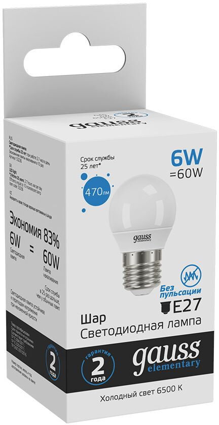 Лампочка светодиодная E27 Шар 6W холодный белый свет 6500К упаковка 10 шт. Gauss Elementary