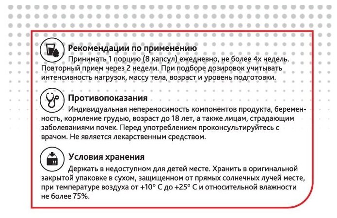 | Дополнительная информация | размер порции: 8 шт.; рекомендации по применению: Способ применения: Принимать одну порцию (8 капсул) ежедневно, не более 4х недель. При подборе дозировок учитывать интенсивность нагрузок, массу тела, возраст и уровень подготовки.; состав: креатина моногидрат |