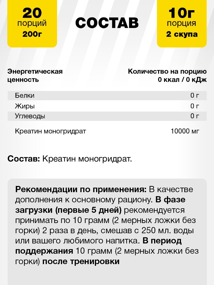 | Дополнительная информация | размер порции: 10 шт.; энергетическая ценность на 100 г: 0; рекомендации по применению: В качестве дополнения к основному рациону. В фазе загрузки (первые 5 дней) рекомендуется принимать по 10 грамм (2 мерные ложки без горки) 2 раза в день, смешав с 250 мл воды или вашего любимого напитка. В период поддержания рекомендуется принимать по 10 грамм (2 мерных ложки без горки) после тренировки.; состав: Креатин моногидрат |