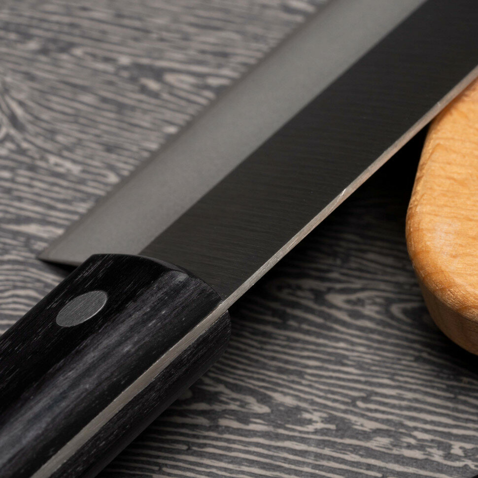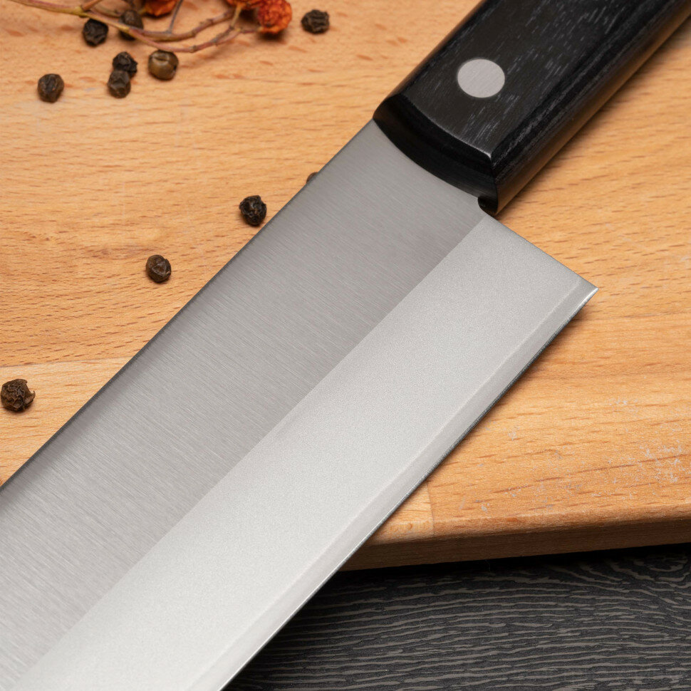 | Плюсы: | Легкий, удобно лежит в руке. Заводская заточка держала месяц при регулярном использовании. Симметричная заточка в 15 градусов - удобно шинковать овощи и нарезать тонкими ломтиками. |