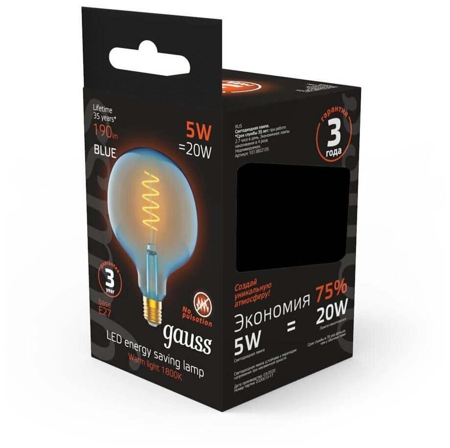 Светодиодная лампа Gauss Filament G125 5W 190lm 1800К Е27 sky blue flexible LED 1/10 интересное: