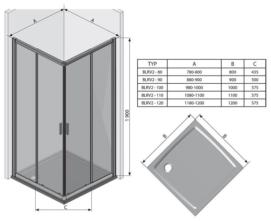 Душевая дверь для уголка Ravak Blix BLRV2K-100 1XVA0U00Z1 (1000х1000х1900мм) профиль сатин/стекло Transparent