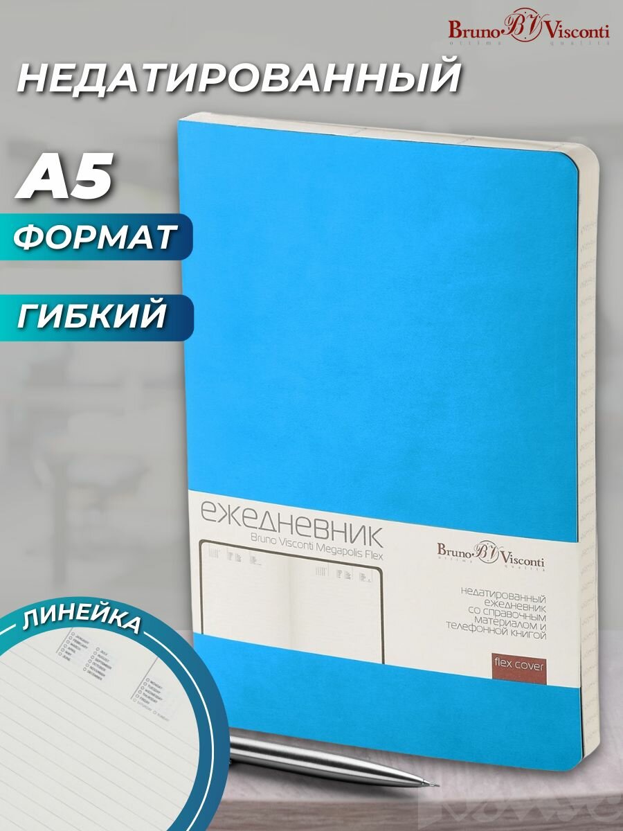 Ежедневник недатированный Bruno Visconti "MEGAPOLIS FLEX" в мягкой обложке, блокнот для записей А5 в линейку небесно-голубой А5 арт.3-531/22