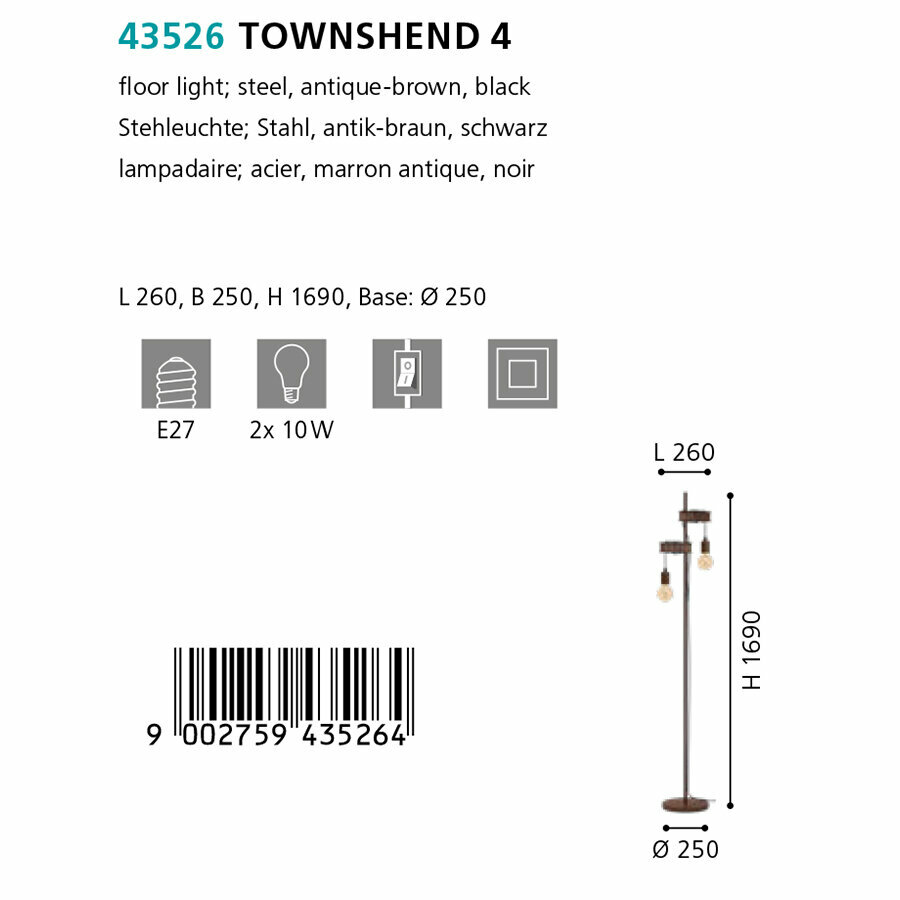 43526 Торшер TOWNSHEND 4, 2Х10W, E27, L260, B250, H1690, основание: Ø250, сталь, античный коричневый