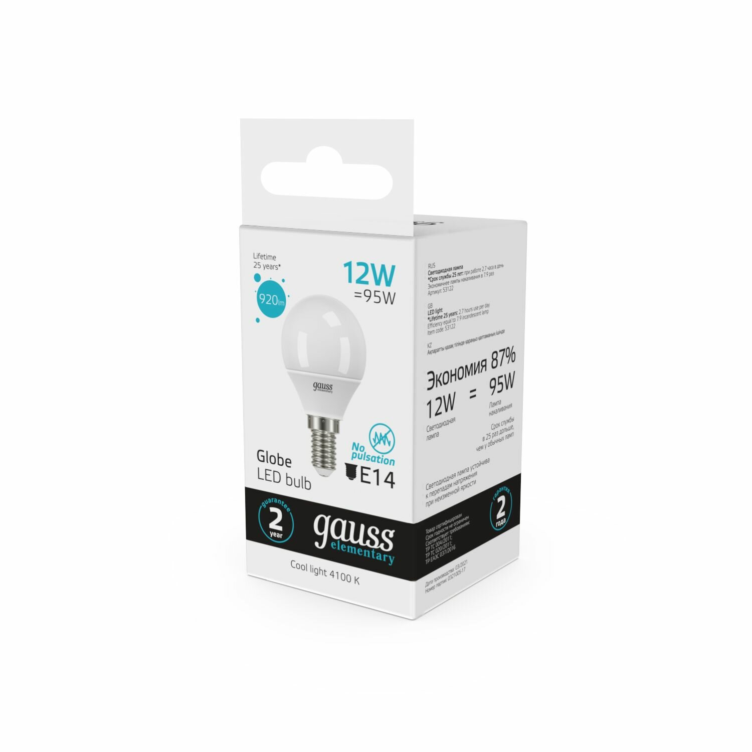 Gauss Elementary Шар G45 E14 12W 920lm 4100K 4K 82х45 матовая, пластик/алюм. 53122 (арт. 677137)