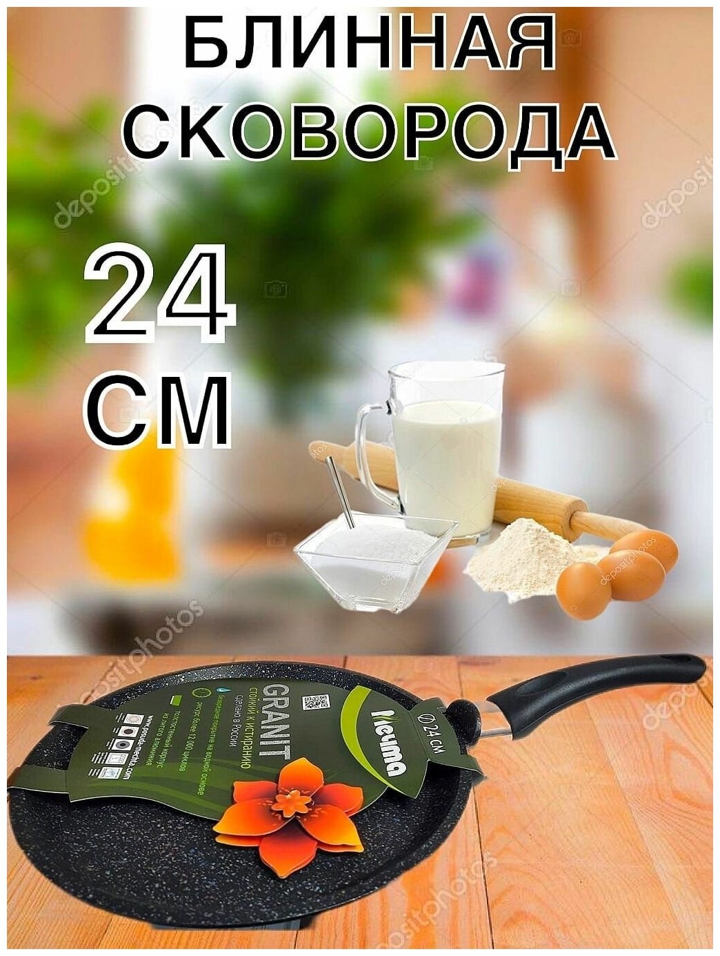 Сковорода антипригарная от Гранит диаметр 24 см, сковорода блинная, сковорода с антипригарным покрытием, сковорода для кухни, блинница интересное: