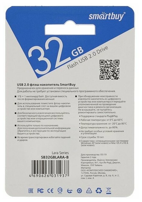 USB накопитель SmartBuy Lara 32GB USB2.0, чёрный