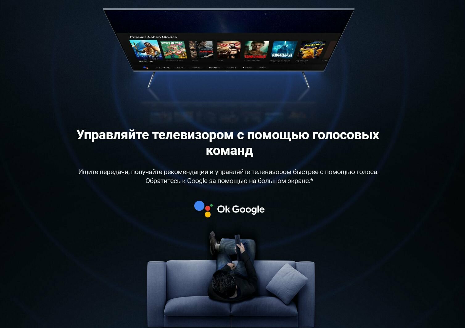 | Плюсы: | Голосовой пульт, отличные цвета (не химические), удобный главный экран, отличный и даже громкий звук. |