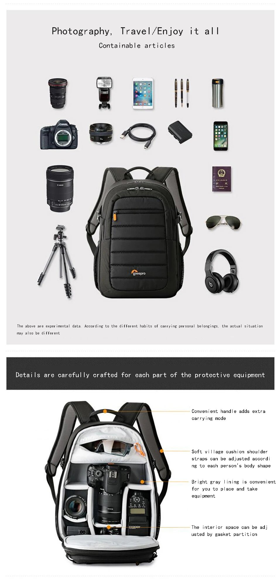 | Минусы: | Давайте посмотрим правде в глаза... что в нем поместится: кропнутая DSLR-камера с небольшим объективом, внешняя вспышка, запасной аккумулятор, зарядник для камеры, возможно небольшой планшет и... всё. По моему мнению, рюкзак рассчитан на любителя, потому как средняя ФФ камера даже без батарейного блока типа 3-го марка или D610 с зумом 24-70 туда помещается с трудом. |