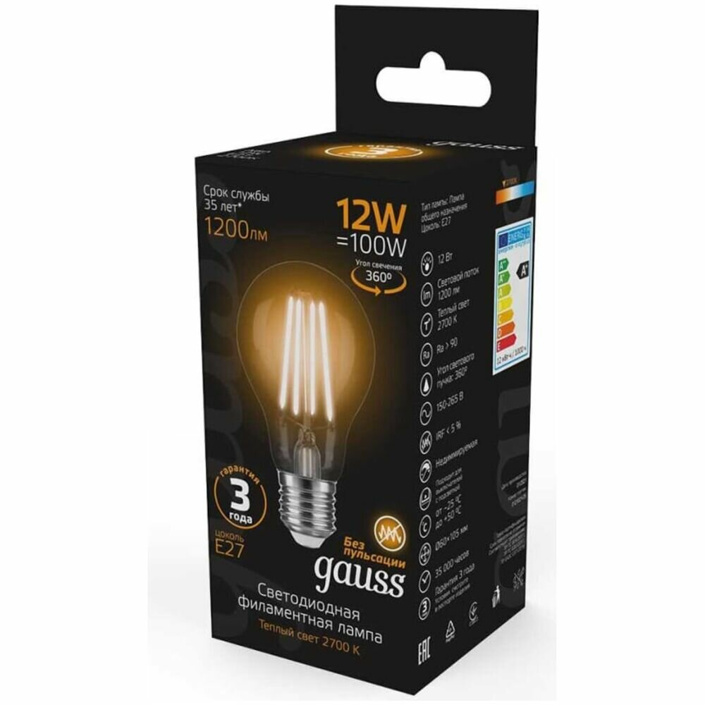 Лампа светодиодная LED 12 Вт 1200 Лм 2700К теплая Е27 А60 Filament , GAUSS 102902112 (1 шт.)