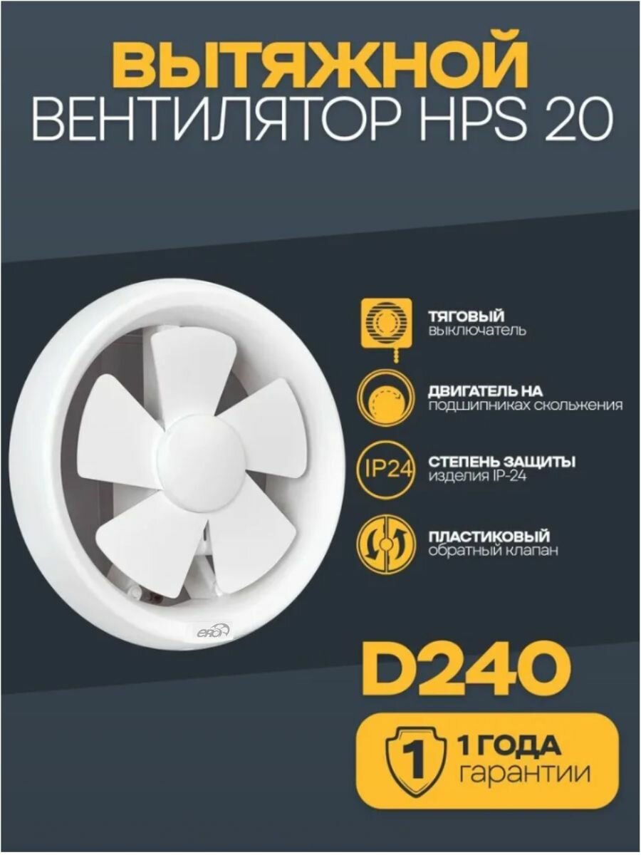 Вентилятор вытяжной оконный ERA HPS 20, D 240 мм, с обратным клапаном, с тяговым выключателем, белый
